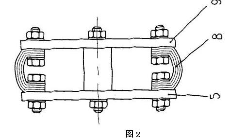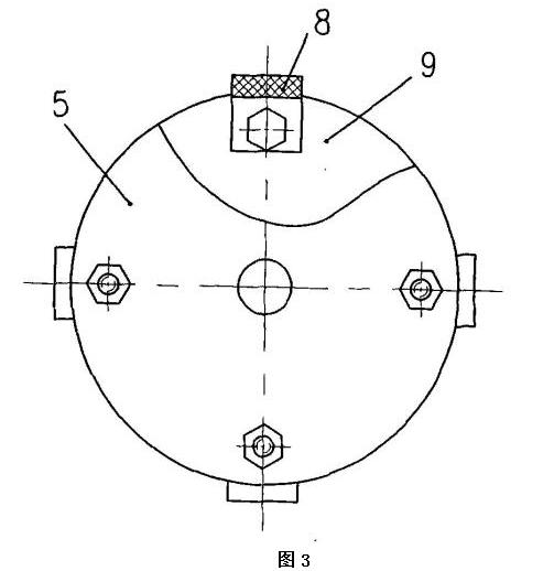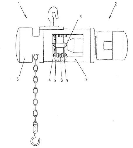該電動(dòng)葫蘆采用獨(dú)特的設(shè)計(jì),利用手拉葫蘆和煤電鉆相結(jié)合,其手拉葫蘆的手拉轉(zhuǎn)輪上沒有纏繞搭接手拉鏈,煤電鉆包括機(jī)殼和卡裝在煤 電鉆的卡具上的鉆桿,手拉轉(zhuǎn)輪與鉆桿同軸設(shè)置,手拉轉(zhuǎn)輪朝外的端面朝向煤電鉆,殼體和機(jī)殼采用固定架固定相連,手拉轉(zhuǎn)輪朝外的端面上固定有手拉轉(zhuǎn)輪法蘭盤,手拉轉(zhuǎn)輪法蘭盤上均布有多個(gè)螺栓孔,每個(gè)螺栓孔處采用緊固件分別與一個(gè)皮帶條的一端固定相連,每個(gè)皮帶條的另一端通過鉆桿法蘭盤上的螺栓孔采用緊固件連接固定在鉆桿法蘭盤上,鉆桿法蘭盤上的螺栓孔位置與手拉轉(zhuǎn)輪法蘭盤上的螺栓孔位置對(duì)應(yīng),鉆桿法蘭盤安裝固定在鉆桿的端頭上。在使用時(shí),當(dāng)需要起吊重物時(shí),可利用煤電鉆的電機(jī)帶動(dòng)鉆桿按照需要的方向旋轉(zhuǎn),鉆桿就會(huì)通過鉆桿法蘭盤、多個(gè)皮帶條8和手拉轉(zhuǎn)輪法蘭盤帶動(dòng)手拉葫蘆的手拉轉(zhuǎn)輪按照需要的方向轉(zhuǎn)動(dòng),從而完成對(duì)重物的起吊。由于采用皮帶條這種軟連接設(shè)計(jì)將煤電鉆的電機(jī)產(chǎn)生的扭矩傳遞到手拉葫蘆的手拉轉(zhuǎn)輪,保證了手拉葫蘆轉(zhuǎn)動(dòng)的平穩(wěn)性,再由于煤電鉆的輸出轉(zhuǎn)速較低,不需要另加減速裝置,故本發(fā)明的利用手拉葫蘆和煤電鉆改造成的電動(dòng)葫蘆的結(jié)構(gòu)非常緊湊,體積也較小,尤其適宜井下機(jī)電硐室起吊、裝卸設(shè)備和物件、以及安撤面使用,并可降低工人勞動(dòng)強(qiáng)度,提高工作效率。