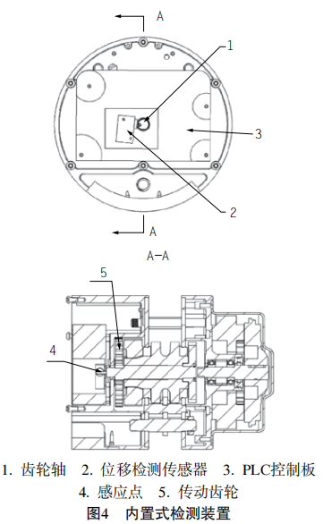 內(nèi)置式高度檢測裝置如圖4所示,它主要由齒輪軸、位移檢測傳感器和PLC控制板組成。齒輪軸位于電動葫蘆內(nèi),齒輪軸貫穿PLC控制板,PLC控制板上設(shè)有位移檢測傳感器,位移檢測傳感器位于齒輪軸旁,PLC控制板與位移檢測傳感器電連接,齒輪軸上設(shè)有感應點,感應點與位移檢測傳感器配合。根據(jù)不同葫蘆的結(jié)構(gòu),在葫蘆電機的齒輪軸上,布置一個凸起或凹陷的感應開關(guān)感應點用于檢測該軸的轉(zhuǎn)動圈數(shù)。電動葫蘆必須配置控制的PLC或單片機,用于處理感應開關(guān)檢測到軸的轉(zhuǎn)動圈數(shù)。每臺環(huán)鏈電動葫蘆會根據(jù)實際鏈條長度,預先在程序中設(shè)定好鏈條的首位限位點。PLC或單片機程序設(shè)定好檢測的軸與起重鏈條運行距離的比例,再根據(jù)檢測軸轉(zhuǎn)動的圈數(shù)計算出鏈條運行的距離,實時計算出吊鉤的高度,當鏈條運行到限位點時會自動停機,起到限位的作用。