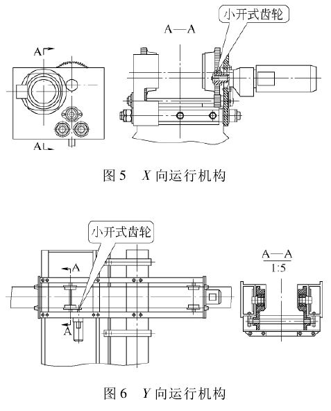 X、Y運(yùn)行機(jī)構(gòu)采用H型鋼運(yùn)行軌道,為解決輪壓分布不均勻,易打滑的現(xiàn)象,車輪采用小開式齒輪—+同步開式齒輪裝置傳動的形式,運(yùn)行機(jī)構(gòu)采用三合一減速電動機(jī),結(jié)構(gòu)簡單,運(yùn)行平穩(wěn),安全可靠。X、Y運(yùn)行機(jī)構(gòu)見圖5和圖6。