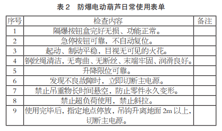 電纜滑車的滾輪材料:防爆電動葫蘆電纜滑車的滾輪使用工程塑料材料,避免因摩擦產生火花。防爆電動葫蘆使用:按照防爆電動葫蘆日常使用表單(見表 2)進行檢查和使用,確保了安全生產。