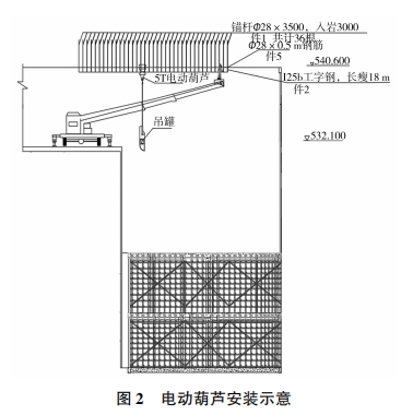 在抽水蓄能電站地下廠房土建及機(jī)電設(shè)備安裝施工過(guò)程中,因施工場(chǎng)地空間受限,導(dǎo)致材料垂直運(yùn)輸通道單一影響現(xiàn)場(chǎng)施工進(jìn)度。為解決此類問(wèn)題,利用電動(dòng)葫蘆具有體積小、自重輕、操作簡(jiǎn)單、使用方便等特點(diǎn),采用在副廠房頂拱巖體位置安裝電動(dòng)葫蘆、副廠房各樓層預(yù)留吊物孔的方式,形成副廠房臨時(shí)垂直運(yùn)輸通道,滿足土建施工期模板、腳手架。機(jī)電設(shè)備安裝期空壓機(jī)氣罐、電氣盤柜等材料設(shè)備的轉(zhuǎn)運(yùn),有效利用現(xiàn)場(chǎng)施工空間。從而達(dá)到提升施工效率、降低現(xiàn)場(chǎng)施工強(qiáng)度及節(jié)約施工成本的目的。