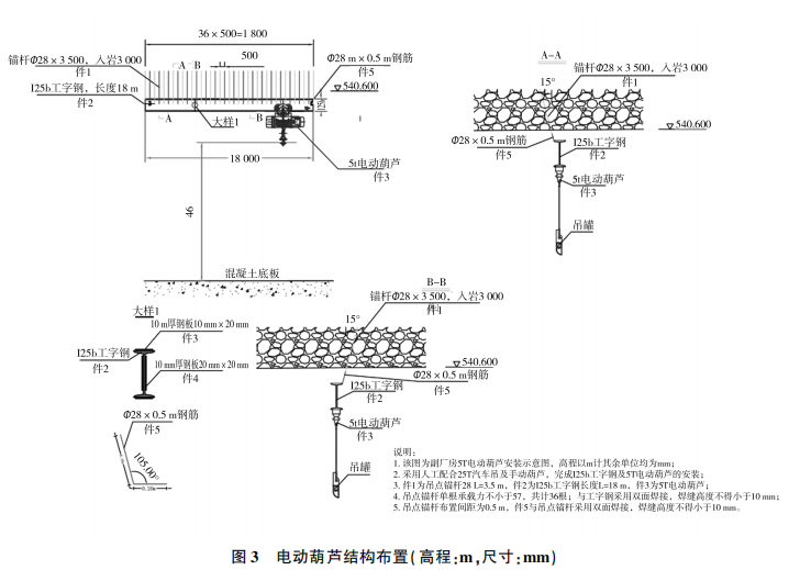 吊點(diǎn)錨桿施工:在通風(fēng)機(jī)房樁號(hào)CZO-122.00右6m至主廠房副廠房廠左12m段洞頂供高程540.600m位置布設(shè)一根125b工字鋼長(zhǎng)度18m 。5t電動(dòng)葫蘆通過(guò)125b