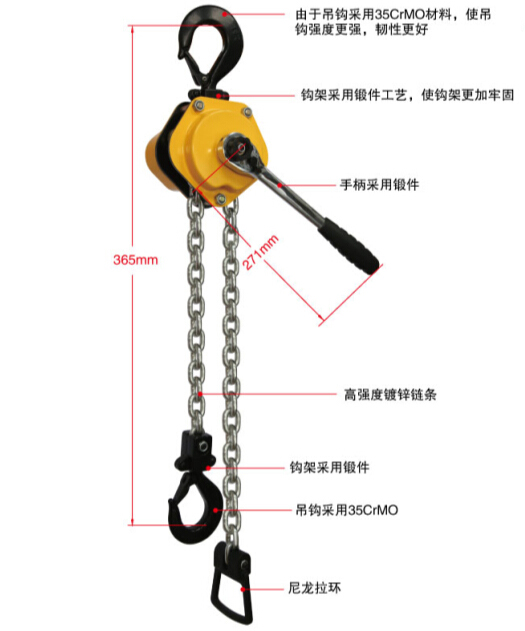 3、 符合人體設(shè)計(jì)工學(xué)的手柄使該葫蘆易于操作。